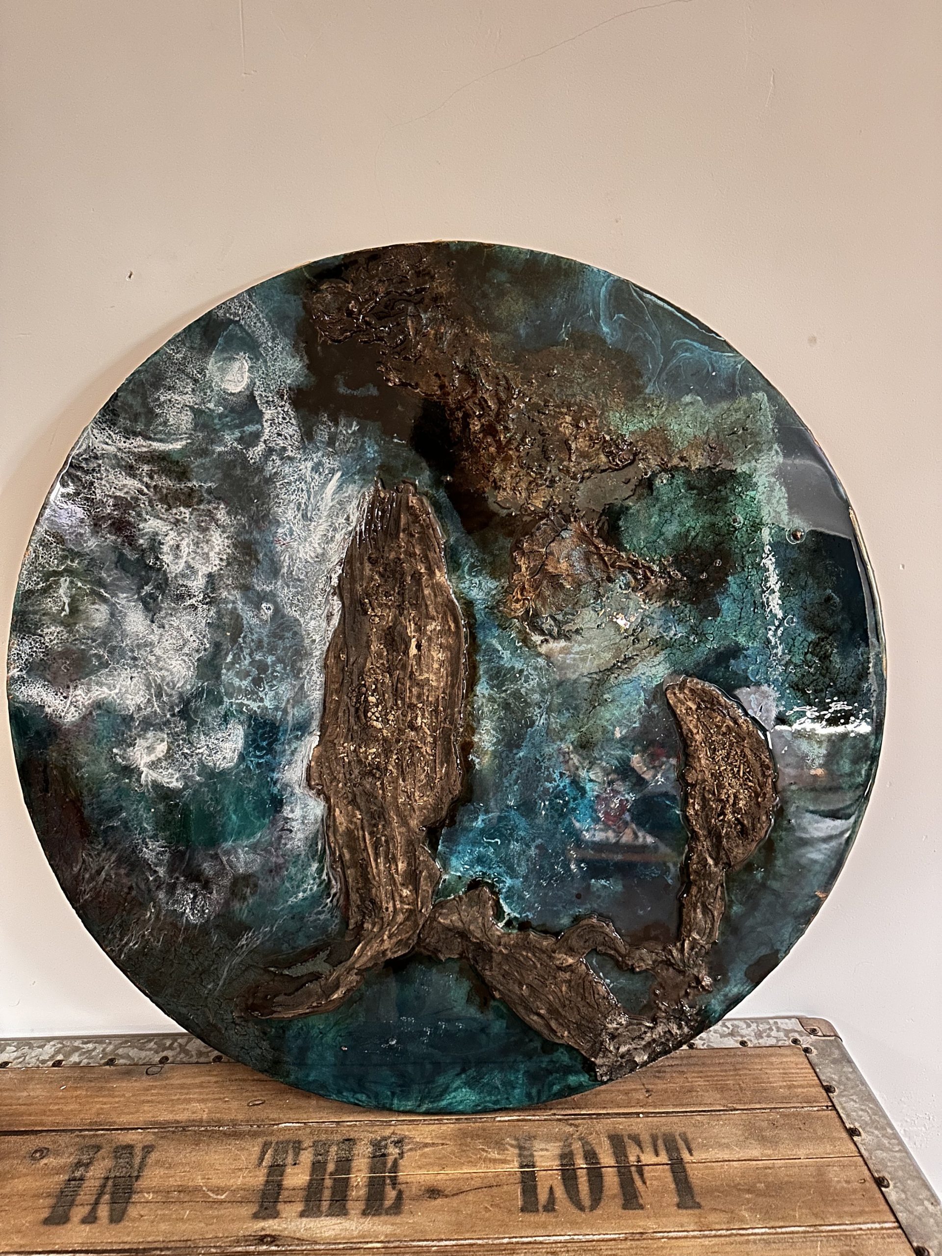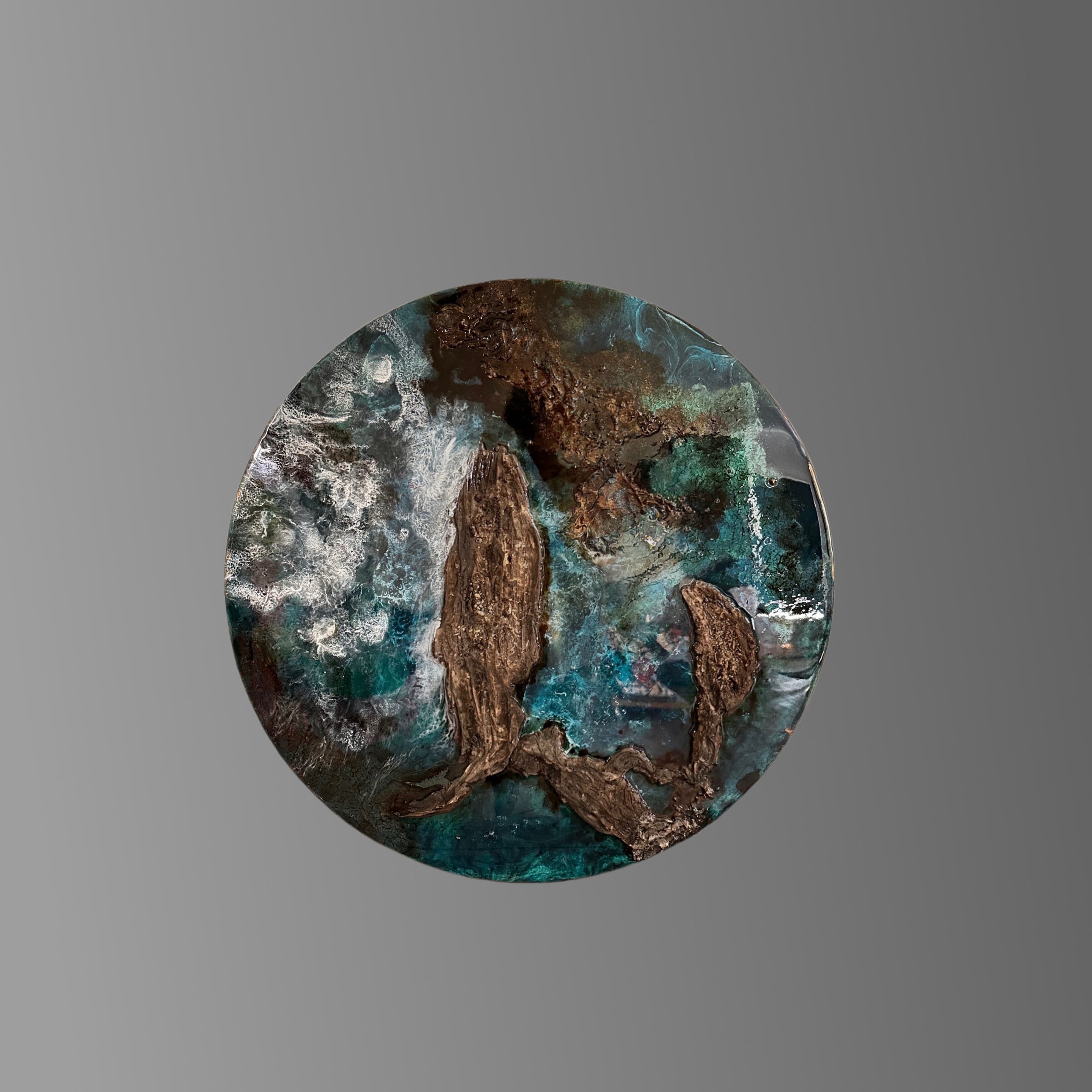 Esta obra de arte única en resina captura la belleza y el misterio de las profundidades marinas. Con una paleta de colores vibrantes y texturas intrincadas, la pieza representa un paisaje submarino lleno de vida y movimiento.
